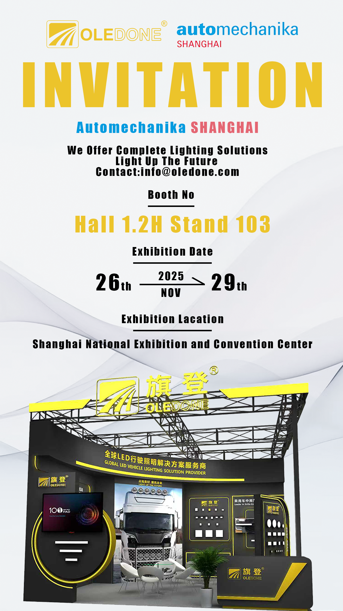 Well-Done (OLEDONE), a global provider of advanced LED vehicle lighting solutions, is pleased to announce that we will be exhibiting at Automechanika Shanghai from November 26–29, 2025, at the National Exhibition and Convention Center (NECC). You can find us at Hall 1.2H · Stand 103.